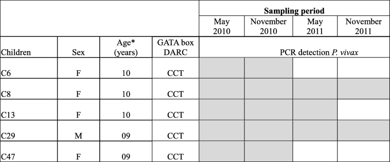 parasites among the five Duffy-negative children across sampling periods (2010–2011), Kedougou, Senegal